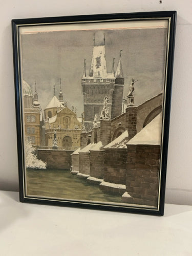 Framed Watercolor of Charles Bridge in Prague Covered in Snow