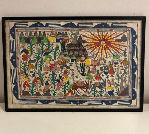 Framed Amate Painting on Amate Bark Paper by Felix Venancio R., signed