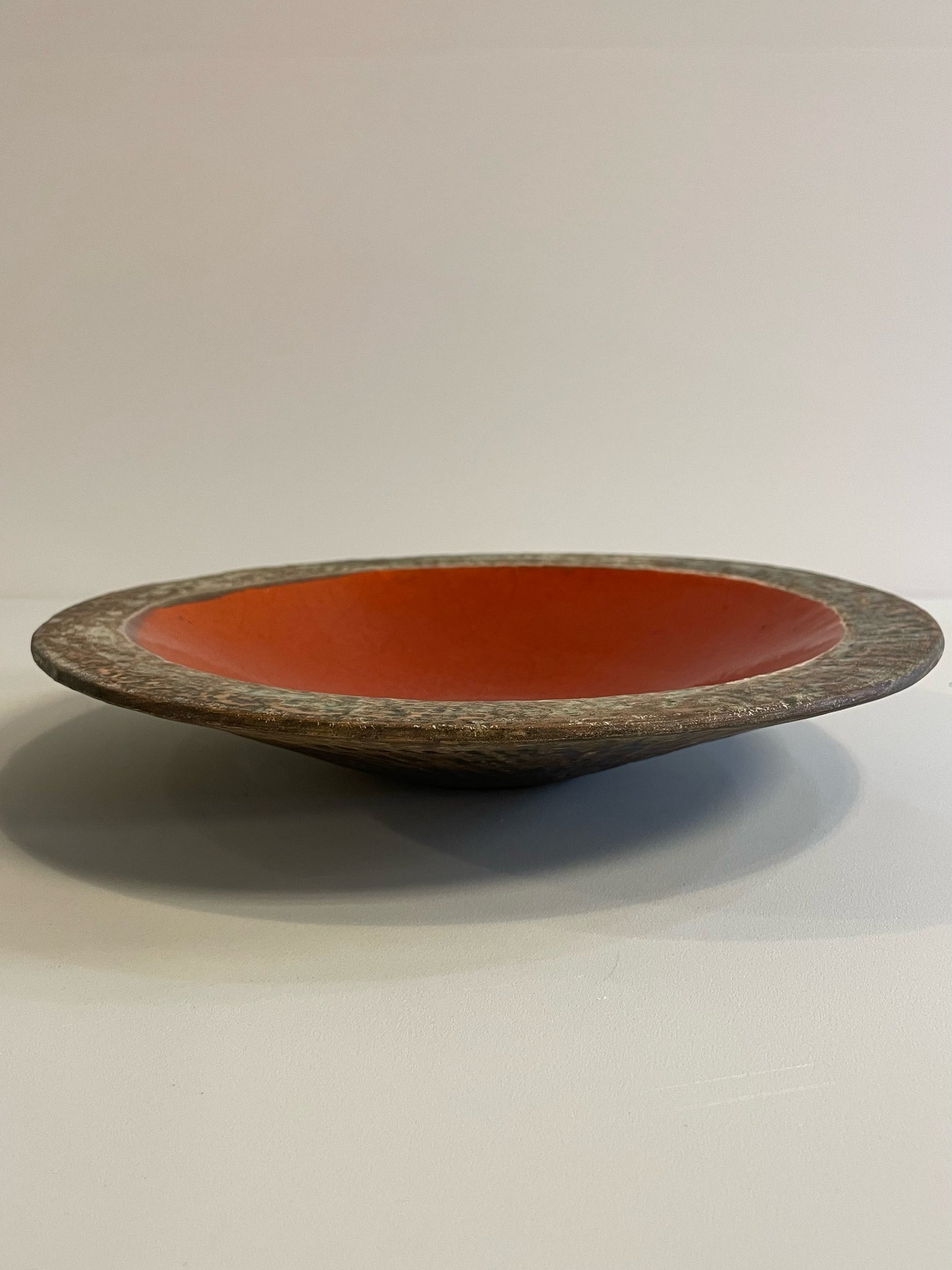 Shallow Pottery Bowl with Orange Glazed Center & Textured Rim