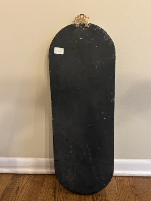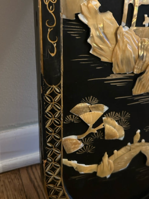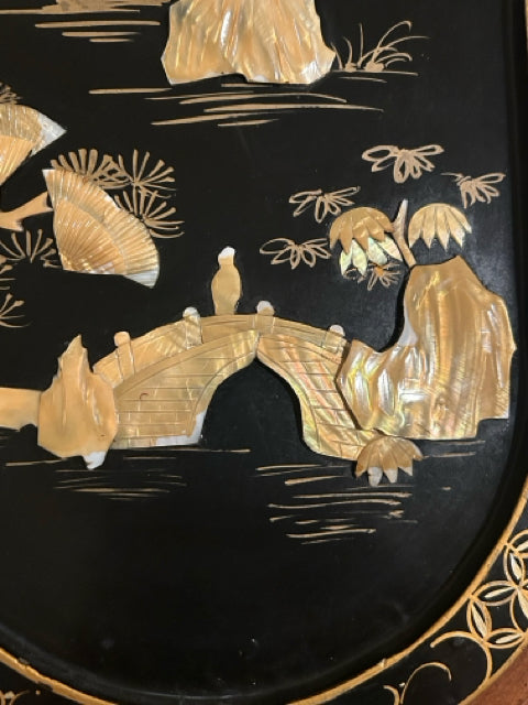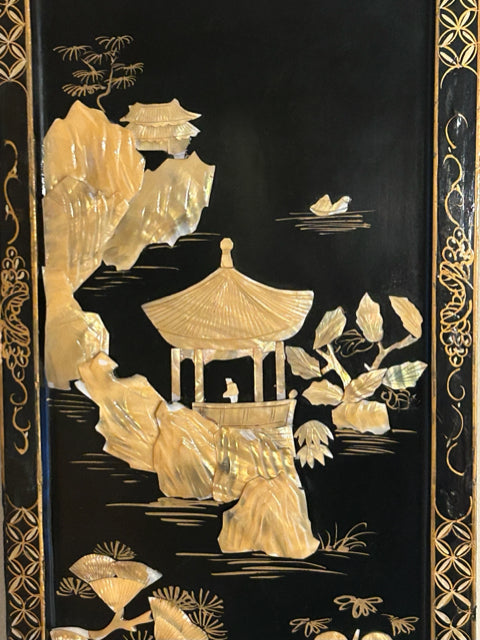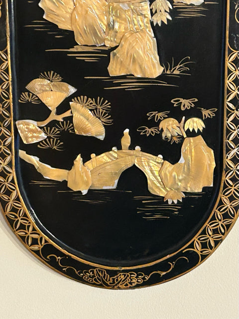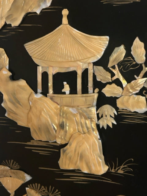 Vintage Asian Black Lacquer Wood Wall Panel with Raised Mother of Pearl Inlay Landscape Scene (II)