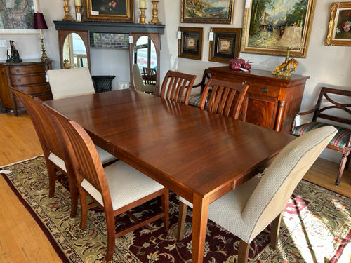 Mission Style Dining Room Table, Three 18" Leaves & Pads, 2 Upholstered Parson Chairs and 4 Side Chairs from Ethan Allen