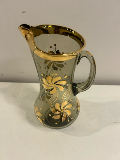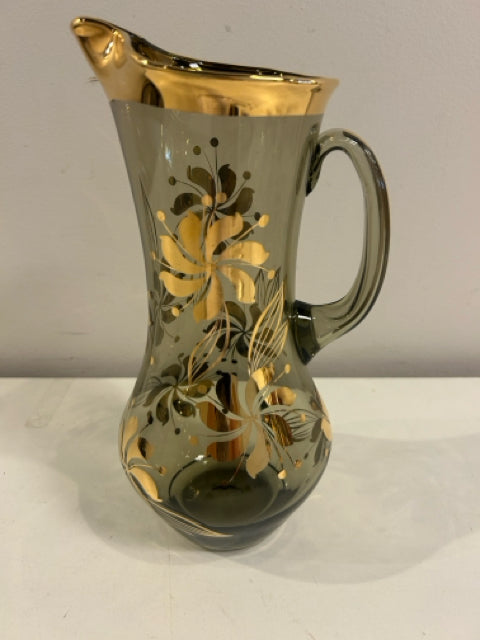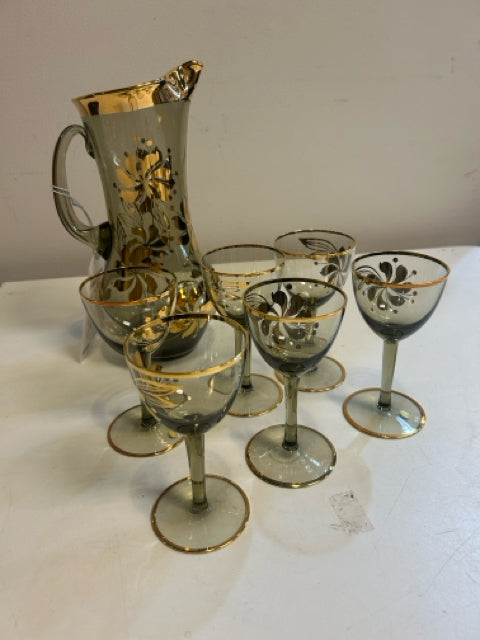 MCM Smoked Glass Pitcher & 6 Glasses with  Gold Detailing made in Hungary