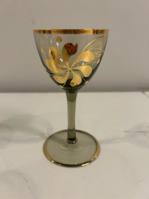 MCM Smoked Glass Pitcher & 6 Glasses with Gold Detailing made in Hungary